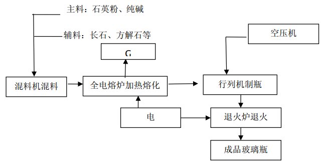 原料在混料機(jī)中進(jìn)行混合后進(jìn)入全電熔爐內(nèi)熔化,熔化好的玻璃液在成型工段進(jìn)行吹制成型,成型后的玻璃瓶進(jìn)入退火爐退火,退火完成后的玻璃瓶在經(jīng)過(guò)質(zhì)檢篩選后送入倉(cāng)庫(kù)。